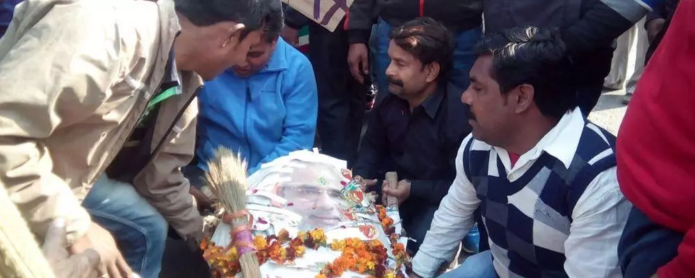 ഡല്ഹിയില് മോദിക്ക് പ്രതീകാത്മക ശവമഞ്ചം തീര്ത്ത് തൊഴിലാളി സമരം