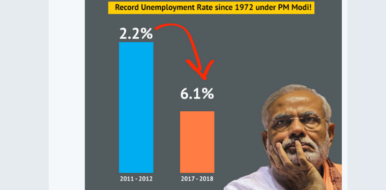 2011 മുതൽ 2012 വരെ രാജ്യത്തെ തൊഴിലില്ലായ്മ നിരക്ക് 2.2 ശതമാനമായിരുന്നെന്ന് കാണിക്കുന്ന ഗ്രാഫ്, മോദി സർക്കാർ അധികാരത്തിൽ വന്നതിന് ശേഷം 2017-2018 കാലയളവിൽ 6.1 ശതമാനമായി ഉയർന്നതായാണ് കാണിക്കുന്നത്. ലഭ്യമായ കണക്കനുസരിച്ച് 1972 മുതലുള്ള ഏറ്റവും ഉയർന്ന തൊഴിലില്ലായ്മ നിരക്കാണിതെന്ന് ചിത്രം സൂചിപ്പിക്കുന്നു.