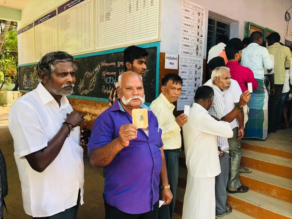 തൂത്തുക്കുടി ലോക്സഭാ മണ്ഡലത്തില് തെങ്കുവീരപാണ്ഡ്യപുരം പഞ്ചായത്ത് സ്കൂളിന് മുന്നില് വോട്ട് ചെയ്യാനായി വരിനില്ക്കുന്നവര്.