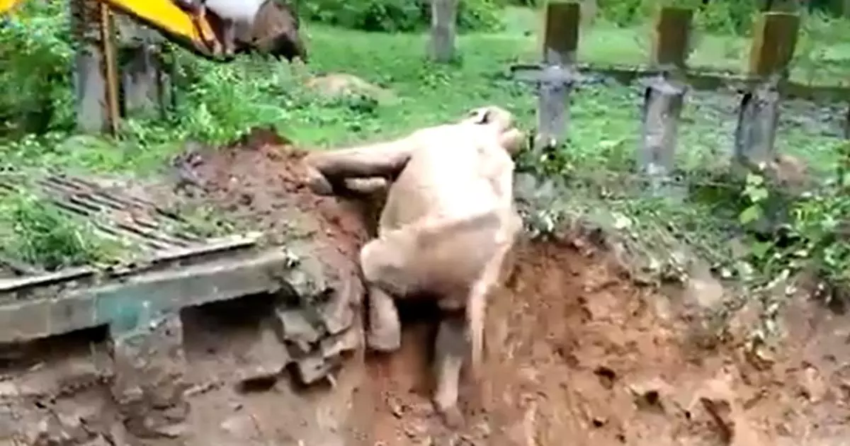 Elephant tried to climb but in vain and the JCB operator had to push it up.pic.twitter.com/K0rwfBovw4