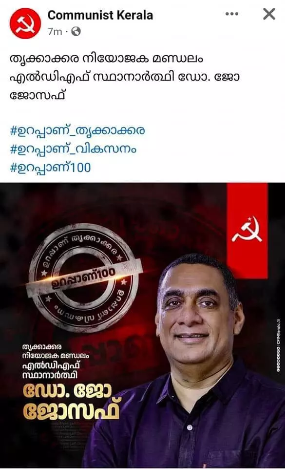 തൃക്കാക്കര നിയമസഭാ മണ്ഡലത്തിലെ സ്ഥാനാർത്ഥിയായി എൽ.ഡി.എഫ് പ്രഖ്യാപിച്ച ഡോ. ജോ ജോസഫിനെ തിരിച്ചറിയാനാകാതെ മുൻ മന്ത്രി ടി.പി രാമകൃഷ്ണനും സി.പി.എം അനുകൂല ഫേസ്ബുക്ക് പേജായ 'കമ്മ്യൂണിസ്റ്റ് കേരള'യും. സ്ഥാനാർത്ഥിയുടെ ഫോട്ടോ സഹിതം പുറത്തിറക്കിയ ഓൺലൈൻ പോസ്റ്ററിലാണ് 'ആൾമാറാട്ടം' നടന്നത്. ആളുമാറി ഫോട്ടോ പ്രസിദ്ധീകരിച്ച പോസ്റ്ററുകൾ ടി.പി രാമകൃഷ്ണന്റെയും കമ്മ്യൂണിസ്റ്റ് കേരളയുടെയും പേജുകൾ പെട്ടെന്നുതന്നെ നീക്കം ചെയ്തെങ്കിലും സ്ക്രീൻഷോട്ടുകൾ പ്രചരിക്കുന്നുണ്ട്.
