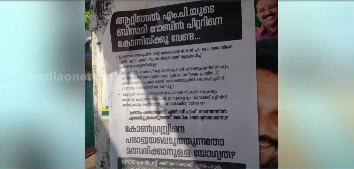 റോബിൻ പീറ്ററെ സ്ഥാനാർഥിയാക്കരുതെന്ന് ആവശ്യപ്പെട്ട് കോൺഗ്രസ് സംരക്ഷണ വേദിയുടെ പേരിലാണ് പോസ്റ്റർ പ്രത്യക്ഷപ്പെട്ടത്
