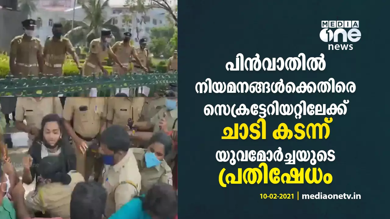 പിന്വാതില് നിയമനങ്ങള്ക്കെതിരെ സെക്രട്ടേറിയറ്റിലേക്ക് ചാടിക്കടന്ന് യുവമോര്ച്ചയുടെ പ്രതിഷേധം