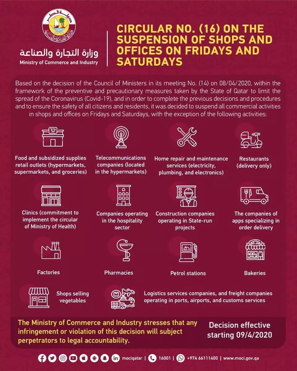 ഭക്ഷ്യ വസ്തുക്കള് ലഭിക്കുന്ന കേന്ദ്രങ്ങള് (സൂപ്പര്മാര്ക്കറ്റുകള്, ഹൈപ്പര്മാര്ക്കറ്റുകള്, ഗ്രോസറികള്) ഭക്ഷ്യ വിഭവങ്ങള് പാര്സല് നല്കുന്ന റസ്റ്റോറന്റുകള്, ഫാര്മസികള്, പെട്രോള് പമ്പുകള്, ഹൈപ്പര്മാര്ക്കറ്റുകളിലുള്ള ടെലികമ്മ്യൂണിക്കേഷന് കമ്പനികള്, വീടുകളിലെ അറ്റകുറ്റപ്പണികള്ക്കുള്ള സര്വീസുകള് (ഇലക്ട്രിസിറ്റി,ഇലക്ട്രോണിക്, പ്ലംബിങ്),ലോജിസ്റ്റിക്സ് കമ്പനികള്, കംസ്റ്റസ് ക്ലിയറന്സുമായി ബന്ധപ്പെട്ട വിഭാഗങ്ങള് തുടങ്ങിയവ മാത്രമേ ഈ ദിവസങ്ങളില് പ്രവര്ത്തിക്കൂ. ഞായര് മുതല് വെള്ളി വരെയുള്ള ദിവസങ്ങളില് കൂടുതല് അവശ്യസേവന കേന്ദ്രങ്ങള് തുറന്നുപ്രവര്ത്തിക്കും.