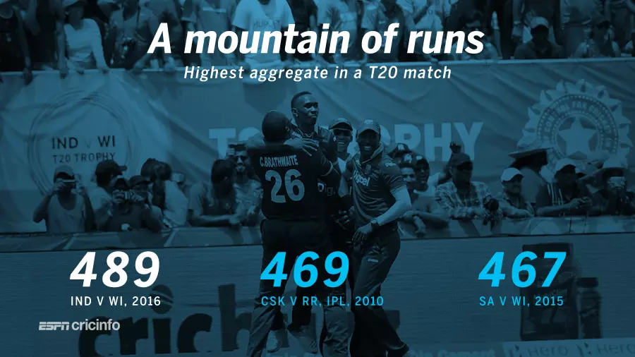 46 പന്തുകളില് നിന്നുമാണ് ഇന്ത്യയുടെ യുവതാരം ലോകേശ്വര് രാഹുല് നൂറിലേക്ക് പറന്നിറങ്ങിയത്. ക്രിക്കറ്റിന്റെ സമസ്ത ഫോര്മാറ്റിലും ഒരു ഇന്ത്യക്കാരന്റെ അതിവേഗ ശതകമാണിത്. ട്വന്റി20 ചരിത്രത്തിലെ രണ്ടാം അതിവേഗ ശതകം കൂടിയായി രാഹുലിന്റെ വെടിക്കെട്ട്. വെസ്റ്റിന്ഡീസ് ബാറ്റ് ചെയ്തപ്പോള് കേവലം ഒരോവറില് മാത്രമാണ് ചുരുങ്ങിയത് ഒരു ബൌണ്ടറിയെങ്കിലും പിറക്കാതിരുന്നത്. ബാക്കിയുള്ള 19 ഓവറുകളിലും ഒരു ബൌണ്ടറിയെങ്കിലും ഇന്ത്യന് ബൌളര്മാര് സമ്മാനിച്ചു. മത്സരത്തില് ഇരുടീമുകളും കൂടി ആകെ നേടിയത് 489 റണ്സ്. ഇതും ട്വന്റി20 ചരിത്രത്തിലെ റെക്കോഡാണ്. 2010ല് ഐപിഎല്ലില് ചെന്നൈയും രാജസ്ഥാന് റോയല്സും ഏറ്റുമുട്ടിയപ്പോള് പിറന്ന 469 റണ്സാണ് പഴങ്കഥയായത്. ട്വന്റി20 ചരിത്രത്തില് ഏറ്റവും കൂടുതല് സിക്സറുകള് പിറന്ന മത്സരവും ഇതാണ് - 32.
