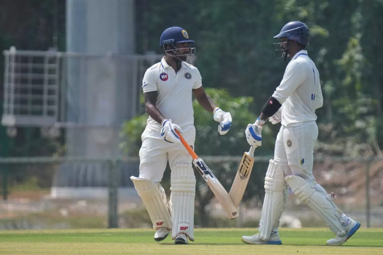 ടോസ് നേടി ബാറ്റിങ് തിരഞ്ഞെടുത്ത കേരളത്തിന് രണ്ടാം ഓവറിൽ തന്നെ ഓപ്പണർ അഭിഷേക് ജെ. നായരെ (1) നഷ്ടമായി. കാർത്തിക് സന്ദിലിന്റെ പന്തിൽ വിഷ്ണുവിന് ക്യാച്ച് നൽകിയാണ് അഭിഷേക് മടങ്ങിയത്. വൈകാതെ 14 റൺസെടുത്ത എ.കെ. ആകർഷിനെ രോഹിത് ധന്ദ ക്ലീൻ ബൗൾഡാക്കി. തുടർന്ന് ഒത്തുചേർന്ന സച്ചിൻ ബേബിയും ബാബ അപരാജിത്തും ചേർന്ന സഖ്യം കേരളത്തിന് പ്രതീക്ഷ നൽകി. ഇരുവരും ഉറച്ചുനിന്നതോടെ ഉച്ചഭക്ഷണത്തിന് പിരിയുമ്പോൾ രണ്ട് വിക്കറ്റ് നഷ്ടത്തിൽ 87 റൺസ് എന്ന നിലയിലായിരുന്നു കേരളം.