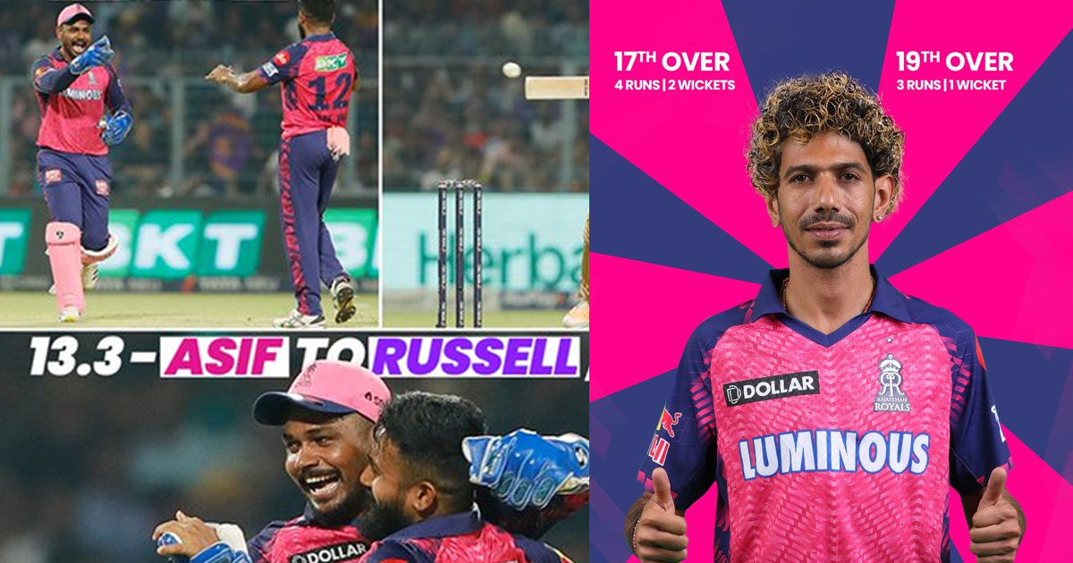 57 റൺസടിച്ച അയ്യരെ ചഹലിന്റെ പന്തിൽ ബോൾട്ട് പിടികൂടി. വെടിക്കെട്ട് താരം റിങ്കു സിംഗിനെയും ചഹലാണ് പുറത്താക്കിയത്. ജോ റൂട്ടിനായിരുന്നു ക്യാച്ച്. ഓപ്പണർമാരായ ജേസൺ റോയ്, റഹ്മാനുല്ല ഗുർബാസ്, നായകൻ നിതീഷ് റാണ, ആൻഡ്രേ റസ്സൽ എന്നിവരൊക്കെ അധികം പൊരുതാതെ പുറത്തായി. ട്രെൻഡ് ബോൾട്ട് റോയിയെ ഹെറ്റ്മെയറുടെയും ഗുർബാസിനെ സന്ദീപിന്റെയും കൈകളിലെത്തിക്കുകയായിരുന്നു. മത്സരം 11ാം ഓവറിലേക്ക് കടന്നതോടെയാണ് നിതീഷ് റാണ കൊൽക്കത്തയുടെ പവലിയനിലേക്ക് മടങ്ങിയത്. ചഹലിന്റെ പന്തിൽ ഹെറ്റ്മെയർ പിടികൂടുകയായിരുന്നു. റസ്സലിനെ മലയാളി ബൗളർ കെ.എം ആസിഫ് അശ്വിന്റെ കൈകളിലെത്തിച്ചു. സുനിൽ നരയ്നെ സന്ദീപിന്റെ പന്തിൽ ജോ റൂട്ട് പിടികൂടി.