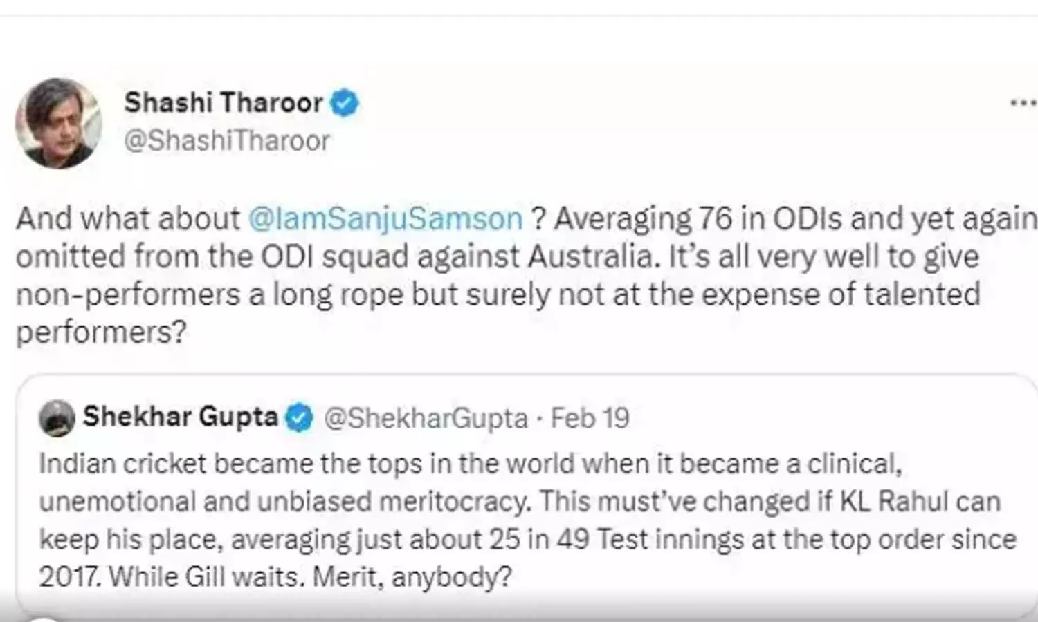 ''ഏകദിനത്തിൽ സഞ്ജുവിന്റെ ശരാശരി 76 ആണ്. എന്നിട്ടും ആസ്ത്രേലിയക്കെതിരായ ഏകദിന പരമ്പരയിൽ നിന്ന് അദ്ദേഹം തഴയപ്പെട്ടു. മോശം ഫോം തുടരുന്നവർക്ക് അവസരം നൽകുന്നത് ശരി തന്നെ, പക്ഷെ അത് കഴിവുള്ളവരെ ഒഴിവാക്കിക്കൊണ്ടാവരുത്''- ശശി തരൂര് കുറിച്ചു.