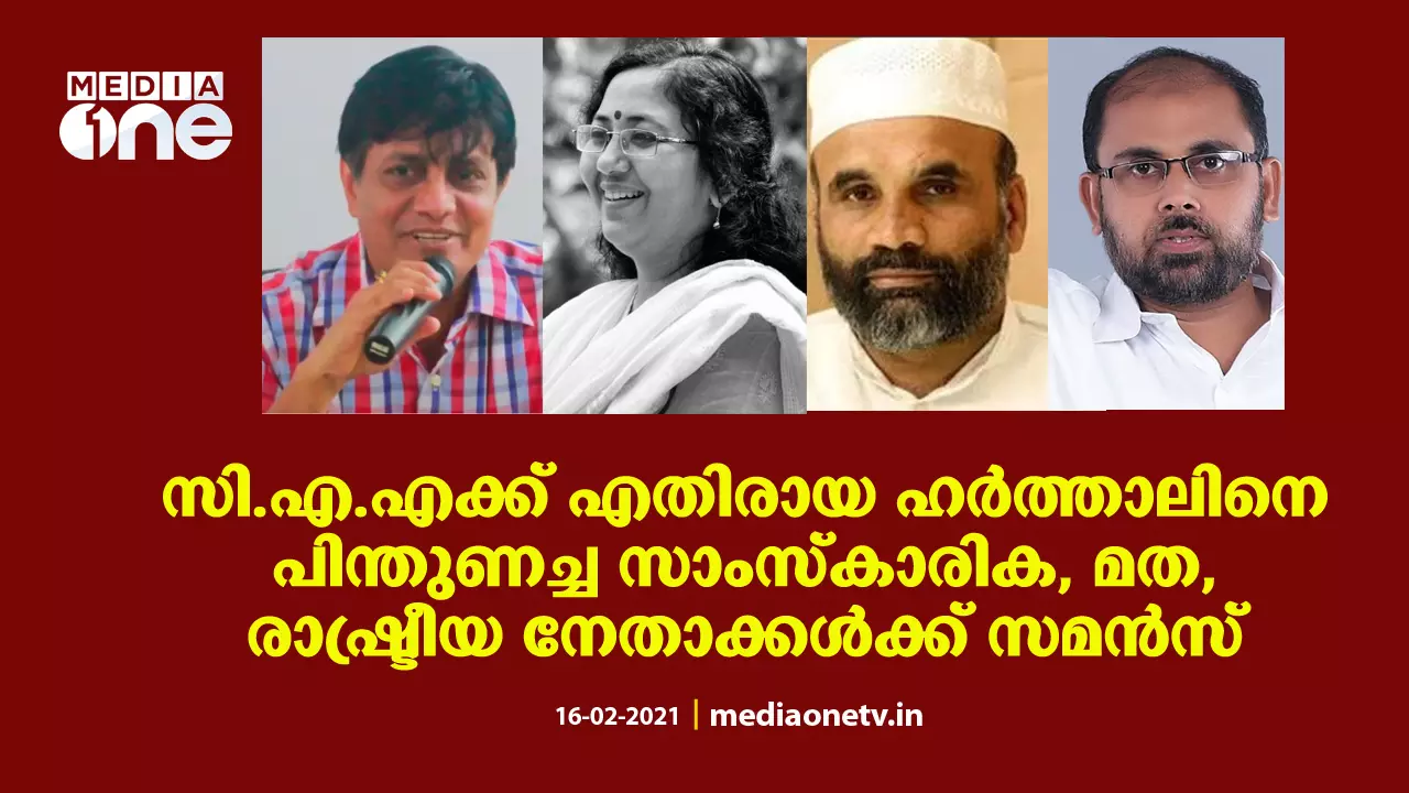 സി.എ.എക്ക് എതിരായ ഹര്ത്താലിനെ പിന്തുണച്ച സാംസ്കാരിക, മത, രാഷ്ട്രീയ നേതാക്കൾക്ക് സമൻസ്
