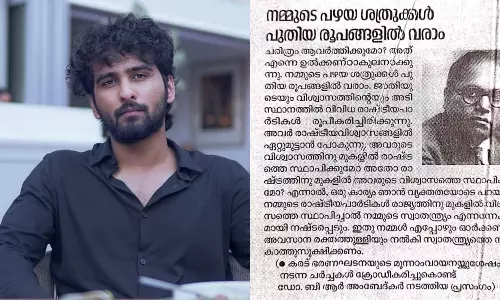 'നമ്മുടെ രാഷ്ട്രീയപാർട്ടികൾ രാജ്യത്തിന് മുകളിൽ വിശ്വാസത്തെ സ്ഥാപിച്ചാൽ നമ്മുടെ സ്വാതന്ത്ര്യം എന്നെന്നേക്കുമായി നഷ്ടപ്പെടും'- പ്രസംഗത്തിൽ അംബേദ്കർ പറഞ്ഞിരുന്നു.