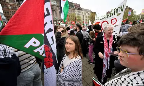 സുഹൃത്തുക്കൾക്കൊപ്പം ഫലസ്തീൻ അനുകൂല പ്ലക്കാർഡുകൾ പിടിച്ചിരിക്കുന്ന ചിത്രമാണ് ഗ്രെറ്റ പങ്കുവെച്ചത്.