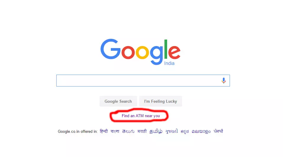 ഗൂഗിളിന്റെ സെര്ച്ച് ബോക്സിന് താഴെയായാണ് Find an ATM near you എന്ന ലിങ്ക് പ്രത്യക്ഷപ്പെട്ടിരിക്കുന്നത്.
