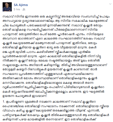ഓണ് ലൈന് ലോകത്തും ഓഫ് ലൈന് ലോകത്തും സജീവ ചര്ച്ചകള്ക്ക് തിരികൊളുത്തിയിരിക്കുകയാണ് നിവിന് പോളി നായക വേഷത്തിലെത്തുന്ന സഖാവ് എന്ന സിനിമ. സിനിമയെയും കമ്മ്യൂണിസത്തെയും ആധുനിക സഖാക്കളെയുമെല്ലാം കോര്ത്തിണക്കിയുള്ള വിമര്ശങ്ങളും അനുകൂല പോസ്റ്റുകളുമെല്ലാം ഫേസ്ബുക്കില് നിറഞ്ഞാടുകയാണ്. ഇതിനിടെ സിനിമ സമകാലിക കേരളത്തോട് പരോക്ഷമായി ഉന്നയിക്കുന്ന ചില ചോദ്യങ്ങള് ചൂണ്ടിക്കാട്ടിയുള്ള ഒരു ഫേസ്ബുക്ക് പോസ്റ്റ് ശ്രദ്ധേയമാകുയാണ്. കാലിക പ്രസക്തമായ ആറ് ചോദ്യങ്ങളാണ് മാധ്യമ പ്രവര്ത്തകനായ അജിംസ് തന്റെ പോസ്റ്റില് ഉള്പ്പെടുത്തിയിട്ടുള്ളത്. അവ ഇവയാണ്.
