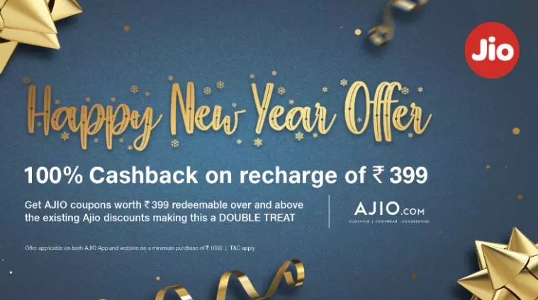 ഡിസംബര് 28 മുതല് ജിയോയുടെ ഈ ന്യൂ ഇയര് ഓഫര് ലഭ്യമായി തുടങ്ങിയിട്ടുണ്ട്. ക്യാഷ് ബാക്കില് ലഭിക്കുന്ന അജിയോ കൂപ്പണ് മാര്ച്ച് 15 വരെയാണ് ഉപയോഗിക്കാനാവുക. പഴയതും പുതിയതുമായ ജിയോ ഉപയോക്താക്കള്ക്ക് ഈ ഓഫര് ലഭ്യമാണ്.