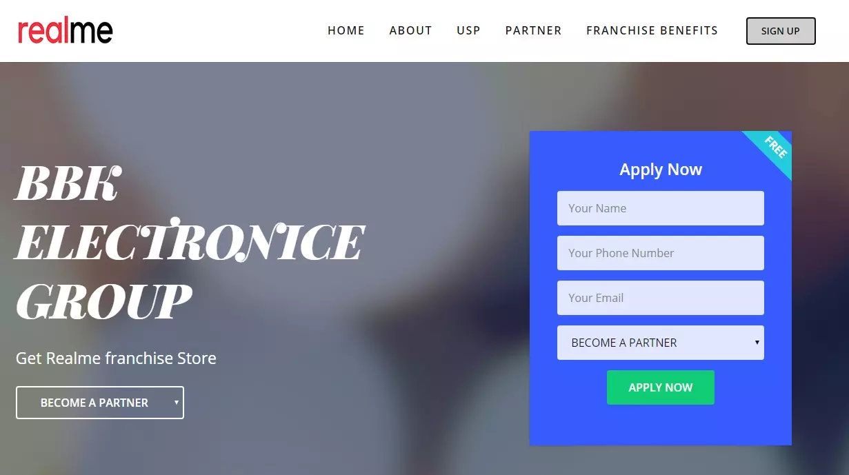 റിയല്മിയുടെ പേരിലുള്ള വ്യാജ വെബ് സൈറ്റ്www.realmepartner.in എന്ന പേരില് തട്ടിപ്പുകാര് തുടങ്ങിയിരിക്കുന്ന വെബ് സൈറ്റിനെക്കുറിച്ചാണ് റിയല്മി ഔദ്യോഗികമായി അറിയിപ്പ് നല്കിയിരിക്കുന്നത്. 'BBK ELECTRONICE GROUP' എന്ന് വലിയ അക്ഷരങ്ങളില് എഴുതിയതാണ് വെബ്സൈറ്റിലെത്തിയാല് ആദ്യം കണ്ണില് പെടുക. ഇതില് ഇലക്ട്രോണിക്സിന്റെ സ്പെല്ലിംങിലെ തെറ്റ് തന്നെ ശ്രദ്ധിച്ചാല് മാത്രമേ തിരിച്ചറിയാനാകൂ. റിയല്മി യില് ഫ്രാഞ്ചൈസി തുടങ്ങാനെന്ന പേരില് അപേക്ഷിക്കുന്നതിനുള്ള മാര്ഗ്ഗവും ഈ സൈറ്റിലുണ്ട്.