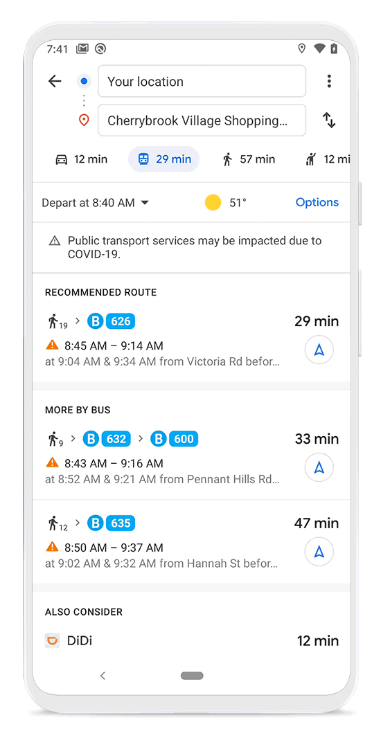 പൊതുഗതാഗതമാണ് യാത്രക്ക് ഉപയോഗിക്കുന്നതെങ്കില് അതുമായി ബന്ധപ്പെട്ട നിയന്ത്രണങ്ങള് റൂട്ട് മാപ്പിനൊപ്പം എഴുതി കാണിക്കും. സര്ക്കാര് തലത്തിലുള്ള നിയന്ത്രണങ്ങളായിരിക്കും ഗൂഗിള് മുന്നറിപ്പ് സന്ദേശങ്ങളായി നല്കുക. ഇത്തരം മുന്നറിയിപ്പുകള് ഇന്ത്യ, അര്ജന്റീന, ആസ്ട്രേലിയ, ബെല്ജിയം, ബ്രസീല്, കൊളംബിയ, ഫ്രാന്സ്, മെക്സിക്കോ, നെതര്ലാണ്ട്സ്, സ്പെയിന്, തായ്ലാന്റ്, യു.കെ, അമേരിക്ക തുടങ്ങിയ രാജ്യങ്ങളിലെ ഉപയോക്താക്കള്ക്ക് ലഭ്യമാണ്.