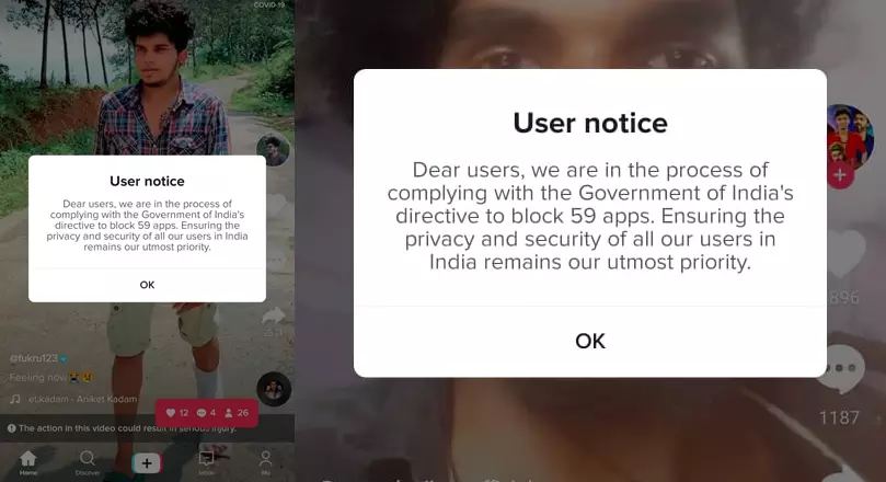 സ്വകാര്യതാ ലംഘനം ചൂണ്ടിക്കാട്ടിയാണ് ടിക് ടോക്ക് അടക്കം 59 ആപ്പുകള് നിരോധിക്കാന് കേന്ദ്ര സര്ക്കാര് ഉത്തരവായത്. ഇന്ത്യ- ചൈന അതിര്ത്തി തര്ക്കത്തെ തുടര്ന്ന് ചൈനീസ് ആപ്ലിക്കേഷനുകള് നിരോധിക്കണമെന്ന് വിവിധ കോണുകളില് നിന്ന് ആരോപണം ഉയര്ന്നിരുന്നു. ഷെയർ ഇറ്റ്, ക്വായ്. യുസി ബ്രൗസർ, ബയ്ഡു മാപ്, ഷെൻ, ക്ലാഷ് ഓഫ് കിങ്സ്, ഡിയു ബാറ്ററി സേവർ, ഹെലോ, ലൈക്കീ, യുക്യാം മെയ്ക് അപ്, മി കമ്യൂണിറ്റി, സിഎം ബ്രൗസർ, വൈറസ് ക്ലീനർ, എപിയുഎസ് ബ്രൗസർ, റോംവി, ക്ലബ് ഫാക്ടറി, ന്യൂസ്ഡോഗ്, ബ്യൂട്ടി പ്ലസ്, വിചാറ്റ്, യുസി ന്യൂസ്, ക്യുക്യു മെയിൽ, വെയ്ബോ, എക്സെൻഡർ, ക്യുക്യു മ്യൂസിക്, ക്യുക്യു ന്യൂസ്ഫീഡ്, ബിഗോ ലൈവ്, സെൽഫി സിറ്റി, മെയിൽ മാസ്റ്റർ ഉള്പ്പെടെയുള്ള 59 മൊബൈല് ആപ്പുകളാണ് നിരോധിച്ചത്.