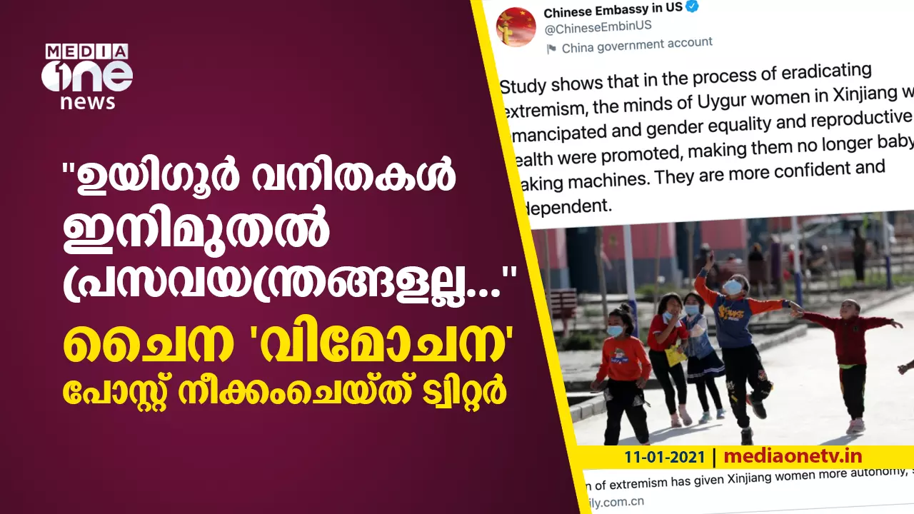 ചൈന വ്യാഴാഴ്ച പോസ്റ്റ് ചെയ്ത ട്വീറ്റിലാണ് സിന്ജിയാങ്ങിലെ ഉയിഗൂര് സ്ത്രീകളുടെ മനസ് മോചിപ്പിക്കപ്പെട്ടുവെന്നും അവരിനി 'കുഞ്ഞുങ്ങളെ ഉണ്ടാക്കുന്ന യന്ത്രങ്ങള്' അല്ലെന്നും പറഞ്ഞത്.