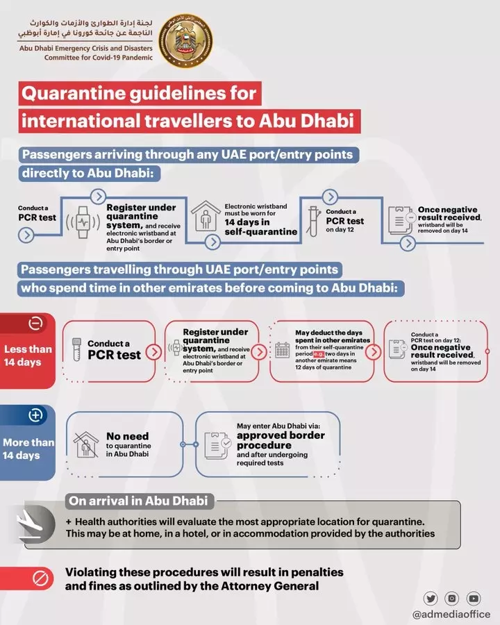 അബൂദബി അല്ലാത്ത മറ്റ് എമിറേറ്റുകളിൽ ഇറങ്ങി അബൂദബിയിലേക്ക് പോകുന്നവർക്കും ക്വാറന്റൈൻ നിയമം ബാധകമാണ്.അബൂദബി എമിറേറ്റിന് പുറത്ത് മറ്റ് എമിറേറ്റുകളിൽ 14 ദിവസത്തിന് താഴെ ചെലവഴിച്ചവരും പി സി ആർ പരിശോധനക്ക് വിധേയമാകണം.
