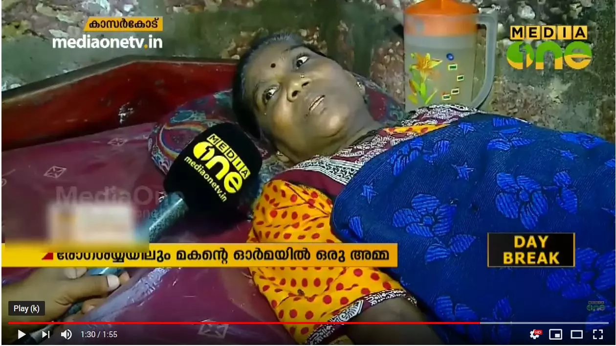 അമ്മയ്ക്ക് രോഗം മൂര്ച്ഛിച്ചപ്പോള് ആശുപത്രിയില് കൊണ്ട് പോവാനാവാത്തതിന്റെ ദു:ഖത്തില് ജീവനൊടുക്കിയ മകന്റെ ഓര്മ്മയിലാണ് ഈ അമ്മ.