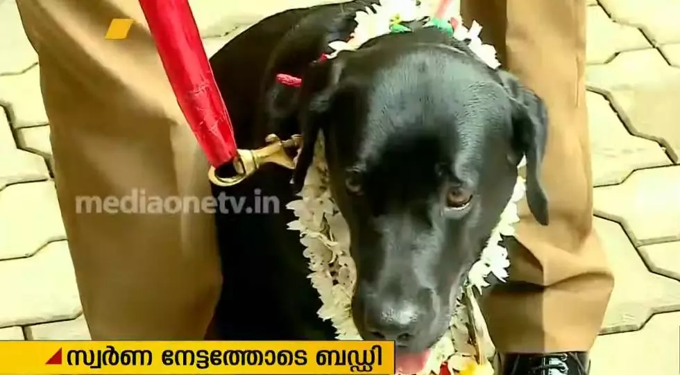 ദേശീയ പൊലീസ് ഡ്യൂട്ടി മീറ്റില് സ്വര്ണ മെഡല് നേടിയ കാസര്കോട് ജില്ലാ പൊലീസ് ഡോഗ് സ്ക്വാഡിലെ പൊലീസ് നായ ബഡ്ഡിക്ക് സ്വീകരണം. ജില്ലാ പൊലീസ് മേധാവി മെഡല് അണിയിച്ചാണ് ബഡ്ഡിയെ ആദരിച്ചത്.