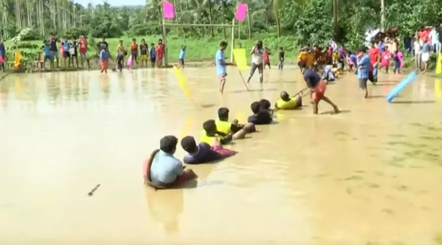 മഴ പെയ്ത്തില് ചെളി നിറഞ്ഞ പാടത്ത് മഴയുത്സവം സംഘടിപ്പിച്ച് കണ്ണൂരിലെ ഒരു ഗ്രാമം