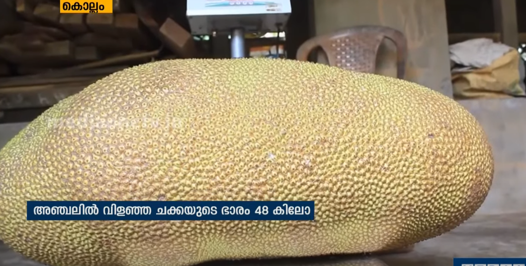 അഞ്ചൽ ഇടമുളയ്ക്കലിലെ ജോണിക്കുട്ടിയുടെ വരിക്ക പ്ലാവിലാണ് ഭീമൻ ചക്ക വിളഞ്ഞത്. അസാധാരണ വലുപ്പം തോന്നിയതോടെ ചക്ക കയറിൽ കെട്ടി താഴെയിറക്കി