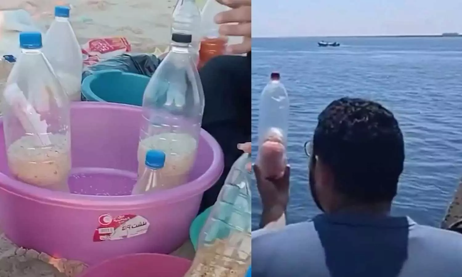 A video posted on social media shows an Egyptian man throwing plastic bottles filled with grain and flour into the sea, hoping they will reach Gaza.