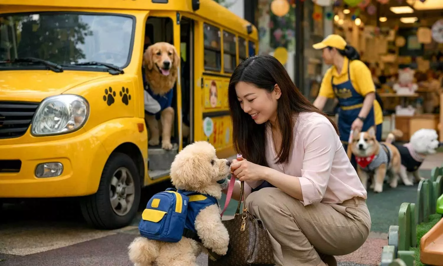 എല്ലാ ദിവസവും രാവിലെ നായ്ക്കുട്ടിയെ സ്കൂളിലേക്ക് കൊണ്ടുപോകാൻ പ്രത്യേക ബസ് വീട്ടിലെത്തും. മനുഷ്യർക്കായുള്ള കിന്റർഗാർട്ടനിലേതുപോലെ ഉച്ചയുറക്കം, ലഘുഭക്ഷണം, കളികൾ എന്നിവയ്ക്കായി കൃത്യമായ സമയക്രമം ഇവിടെയുണ്ട്. മറ്റ് നായ്ക്കളുമായി ഇടപഴകാനും പെരുമാറ്റരീതികൾ പഠിക്കാനും പ്രത്യേക പരിശീലനം നൽകുന്നു. നായയുടെ ദിവസേനയുള്ള പ്രവർത്തനങ്ങളും ആരോഗ്യവിവരങ്ങളും അടങ്ങിയ പ്രോഗ്രസ് റിപ്പോർട്ടും വീഡിയോകളും ഉടമയ്ക്ക് അയച്ചുനൽകും. തത്സമയ വീഡിയോ സംവിധാനങ്ങൾ വഴി ഉടമകൾക്ക് അവരുടെ വളർത്തുമൃഗങ്ങളെ നിരീക്ഷിക്കാനും കഴിയും.
