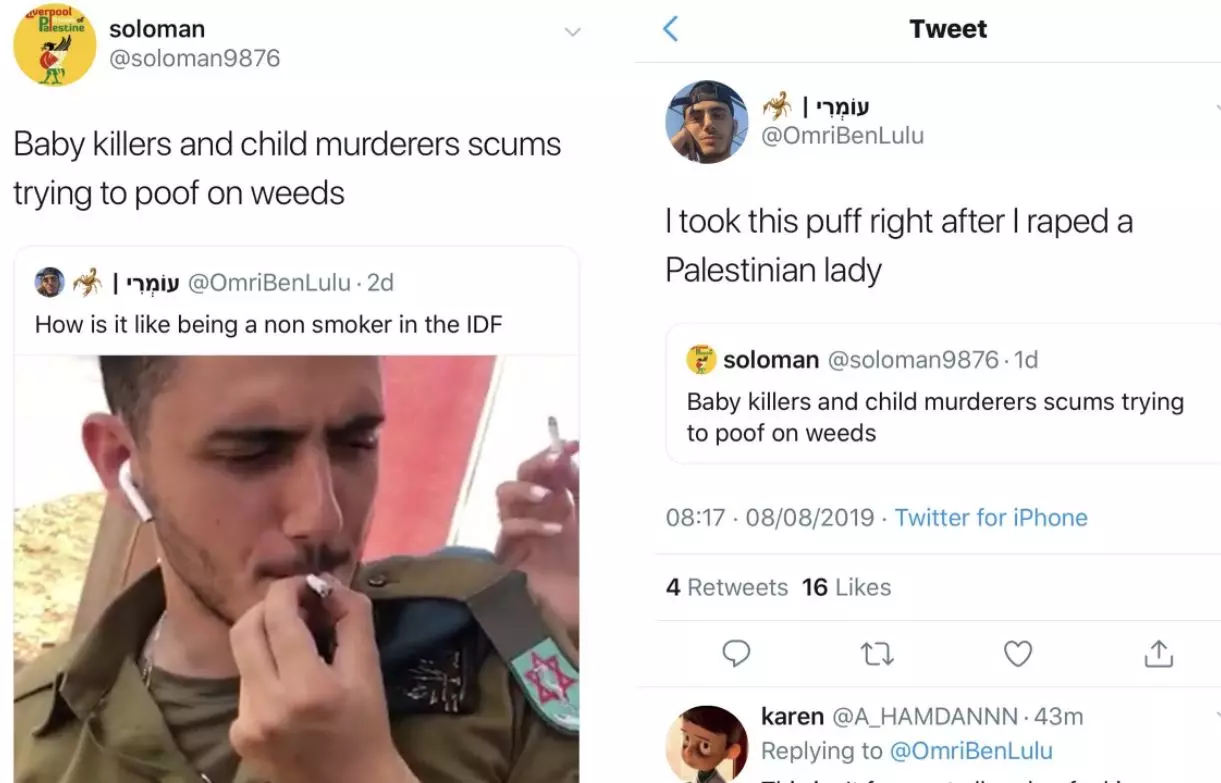 ഉമർ തന്നെ പങ്കുവച്ച പുകവലിക്കുന്ന ചിത്രത്തോടുള്ള ഒരു ഫലസ്തീനിയുടെ പ്രതികരണത്തോടുള്ള മറുപടിയിലായിരുന്നു വിവാദ വീരവാദം. കുട്ടികളെ കൊലപ്പെടുത്തുന്ന സംഘമാണ് ഇസ്രായേൽ സൈന്യം കഞ്ചാവ് ഉപയോഗിക്കുന്നുവെന്നായിരുന്നു ഫലസ്തീനിയുടെ പ്രതികരണം.