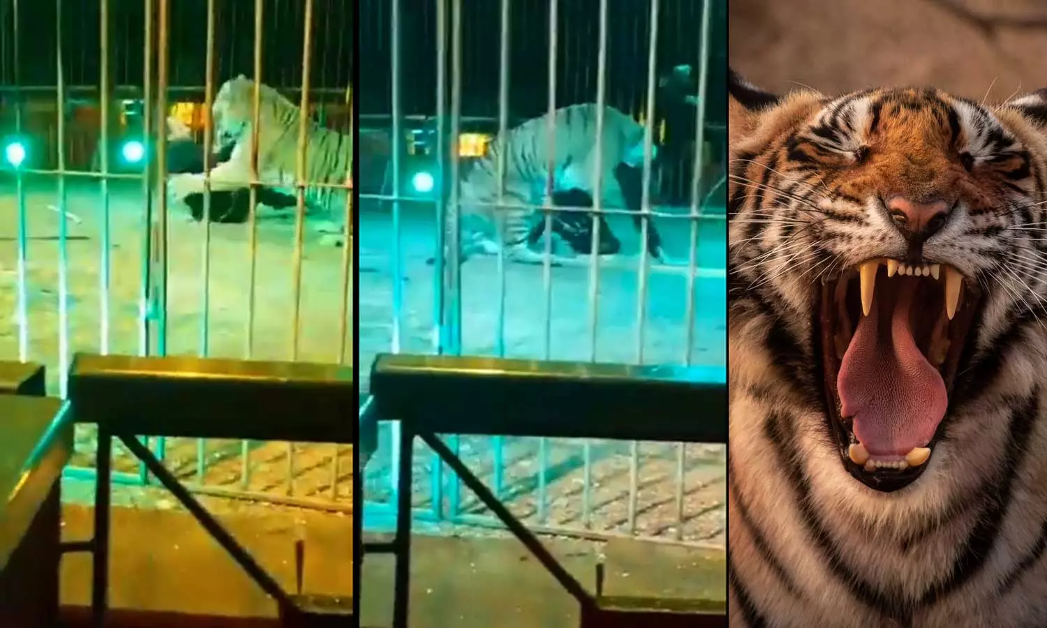 ആദ്യം ട്രെയ്നറുടെ കാലിൽ കടിക്കുന്ന കടുവ ഇദ്ദേഹം നിലത്തു വീഴുന്നതോടെ കഴുത്തിൽ കടിച്ച് വലിക്കുകയായിരുന്നു.