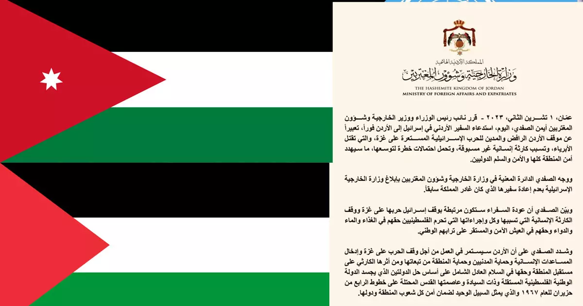 ഇസ്രായേലിലെ അംബാസിഡറെ തിരിച്ചുവിളിച്ച് ദി ഹാഷിമൈറ്റ് കിംഗ്ഡം ഓഫ് ജോർദാൻ. ഇസ്രായേലിലെ തങ്ങളുടെ അംബാസിഡറെ തിരിച്ചുവിളിച്ചതായും അവരുടെ പ്രതിനിധിയെ അയക്കേണ്ടെന്ന് പറഞ്ഞതായും ജോർദാൻ വിദേശകാര്യ മന്ത്രി അയ്മൻ സഹാദിയാണ് അറിയിച്ചത്. ആയിരക്കണക്കിന് ഫലസ്തീനിയൻ സാധാരണക്കാരെ കൊന്ന ഗസ്സയിലെ യുദ്ധത്തിൽ പ്രതിഷേധിച്ചാണ് നടപടിയെന്നും അദ്ദേഹം എക്സിൽ (ട്വിറ്റർ) വ്യക്തമാക്കി. യുദ്ധം വരും തലമുറകളെ വേട്ടയാടുന്ന മാനുഷിക ദുരന്തത്തിനും പ്രദേശത്തെ അരക്ഷിതാവസ്ഥക്കും കാരണമാകുമെന്നും ട്വീറ്റിൽ വിമർശിച്ചു. ഗസ്സ അതിക്രമത്തിനെതിരെ പ്രതിഷേധങ്ങൾ കനത്തതോടെ ജോർദാനിലെ ഇസ്രായേലി അംബാസിഡർ രണ്ടാഴ്ച മുമ്പ് രാജ്യം വിട്ടിരുന്നു.